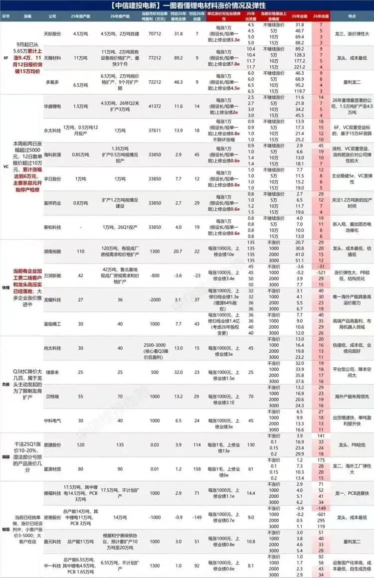 2、#有资源布局的锂电池企业有望受益并扩张盈利,主要包括:1)宁德时代:直接布局宜春枧下窝锂云母矿和四川斯诺威锂矿,宜春复产时间尚未明细,但复产后年化产能近10万吨;斯诺威预计26年有工程矿增量;同时公司持有天华新能13.54%股权、洛阳钼业19.7%股权(24.9%×79.2%),预计2026年与锂相关的收益在50-60亿元(不考虑宜春为30亿元),考虑洛钼的总收益或达100-120亿元。2)鹏辉能源:持有西藏阿里地区兆源同硼矿业100%股权,核心资产是革吉县夏布错盐湖的硼、锂、钾矿产资源,乐观看2027H2有望形成产能,将贡献可观的盈利弹性。且鹏辉出货基本为储能,价格传导顺利,尤其是户储有超涨空间。3)国轩高科:布局宜春锂云母产能,目前白水洞矿区在产,2025年碳酸锂产量接近1万吨,若后续水南塅矿区也开启,公司也将有积极的资源收益弹性。