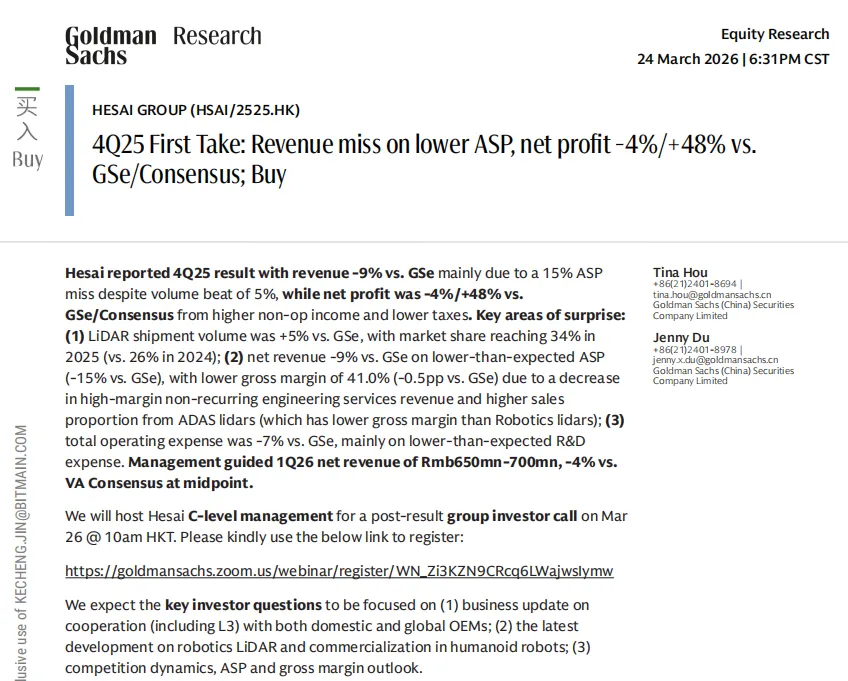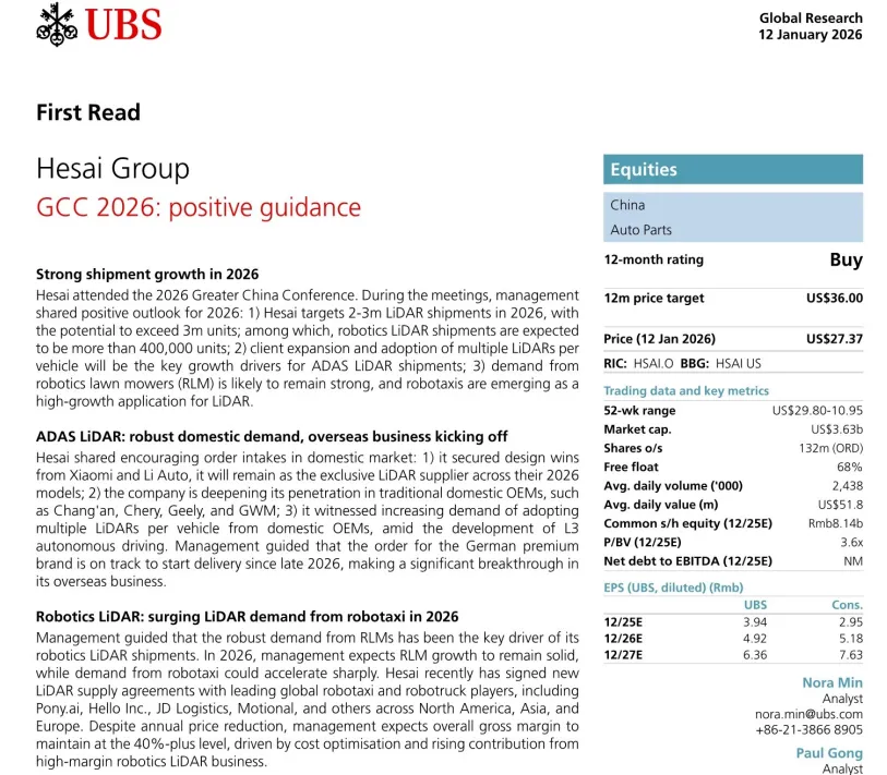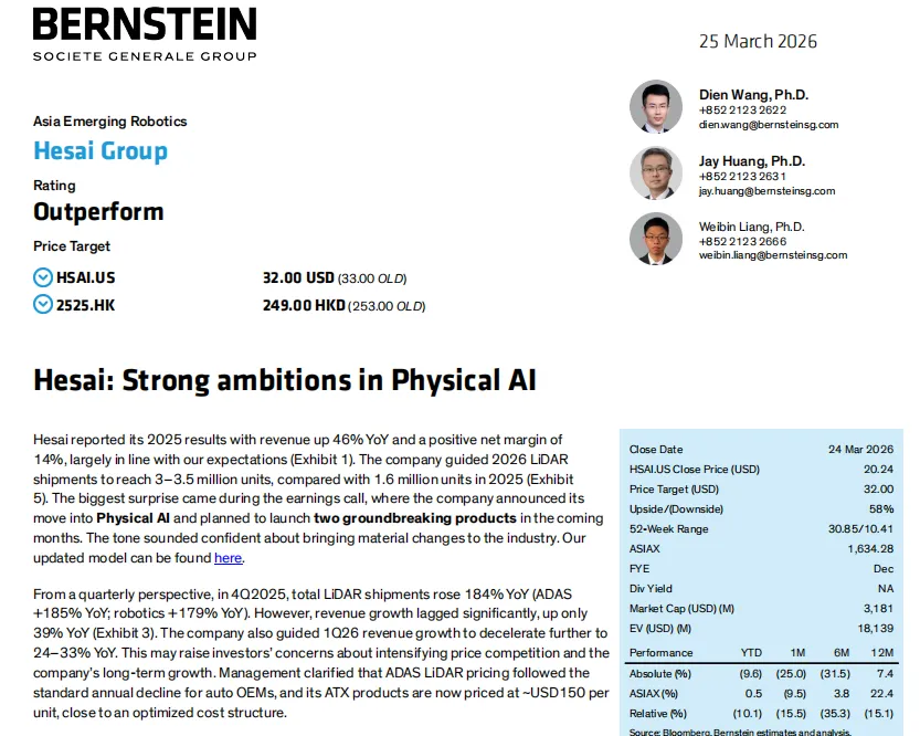 核心摘要:本报告整合伯恩斯坦、高盛、瑞银(UBS)、中金公司、招商证券五大机构对禾赛科技的深度研究成果,全面覆盖公司2025年业绩表现、核心业务进展、技术与竞争壁垒、新业务布局、机构估值评级及核心风险提示。禾赛科技作为全球激光雷达龙头,2025年实现营收同比46%高增、全年净利润转正,成为全球首家实现盈利的上市激光雷达企业;2026年激光雷达出货量指引大幅上调至300-350万台,同时正式宣布进军物理AI领域,打开第二增长曲线。海内外主流机构均对公司维持买入/跑赢评级,长期看好其在ADAS、机器人及物理AI领域的成长潜力。