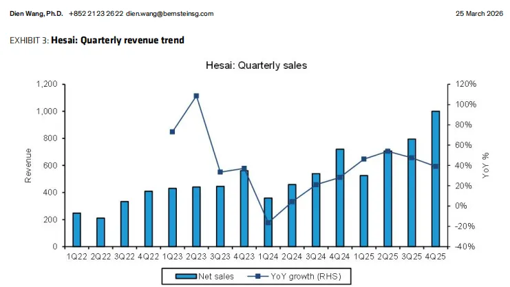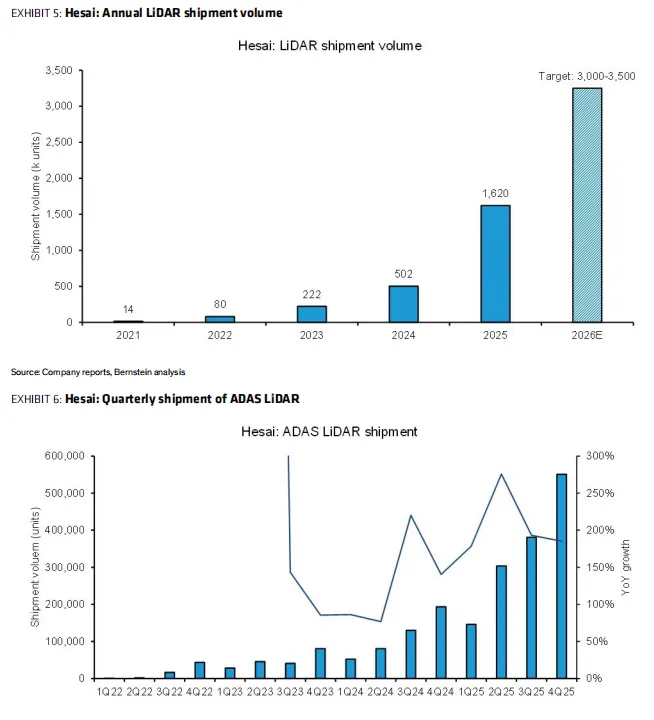 公司预计2026年激光雷达总出货量达300-350万台,较2025年实现翻倍以上增长,其中ADAS业务仍是核心增长主力。