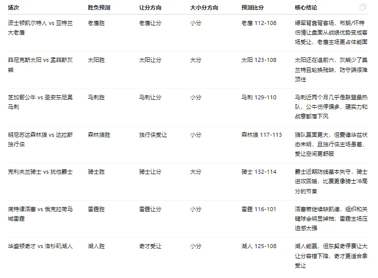 基础面:活塞 54胜20负东部第1,雷霆 59胜16负西部第1,这其实是今天最硬的一组基本面。数据面:我抓到的主流盘在雷霆 -14 左右,ESPN 开盘显示 -13.5,合计分在 219.5 附近,说明市场对活塞的缺员非常敏感。伤病面:活塞这边奥萨尔、邓肯·罗宾逊、托拜亚斯、杜伦等多人赛前决定,而凯德·坎宁安因气胸缺阵是最大的结构性影响;雷霆这边此前杰伦·威廉姆斯已经回归。对位面:如果没有凯德,活塞很难持续破解雷霆的第一道压迫,亚历山大和雷霆的外线防守会把比赛往半场绞杀。赛程体能:雷霆刚击败尼克斯,主场 31胜6负;活塞最近仍强,但没有凯德后,持球终结层级还是掉了一档。战意:两边都有战意,但雷霆主场复仇味道更重,毕竟 2 月底活塞曾赢过他们。盘口热度:活塞战绩再好,只要凯德不在,市场还是更愿意压雷霆深盘。结论:我选雷霆胜,雷霆让分,小 219.5;预测116-101。307 华盛顿奇才 vs 洛杉矶湖人