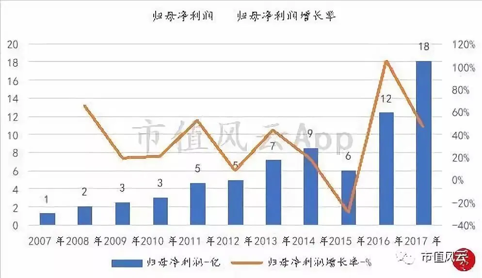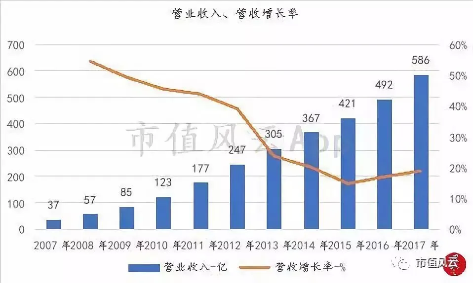 从可获取财务数据来看,公司的销售收入一直稳健增长,从上市之初的123亿增长到2017年的586亿。