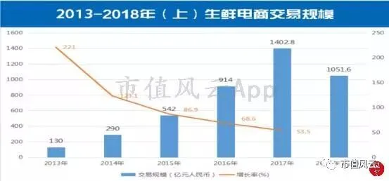 据中国电子商务研究中心研究数据显示,2013年以来,我国生鲜电商的交易规模从130亿增长至2017年的1402亿,年均CAGR达到81%,2018年上半年,生鲜电商交易规模达到1051.6亿,较2017年上半年851.4亿元,同比增长23.5%。