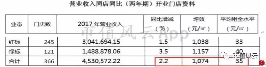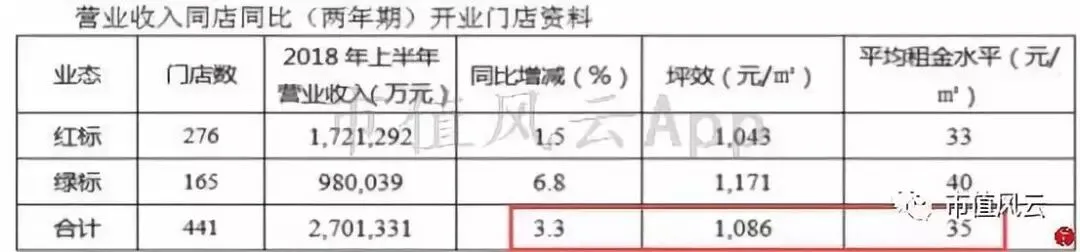 从最近两年门店管理的效益来看,2017年,红标、绿标店营收同比增长2.2%,坪效1074元/平米,2018年上半年,在租金水平不变的情况下,红绿标店营收同比增长3.3%,坪效提高至1086元/平米。