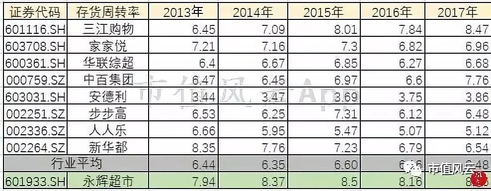 其中的关键之一在于存货周转率,无论是卖生鲜还是其他商品零售,卖的好还要必须卖得快,从存货周转率就能知晓各商超的销售效率情况。