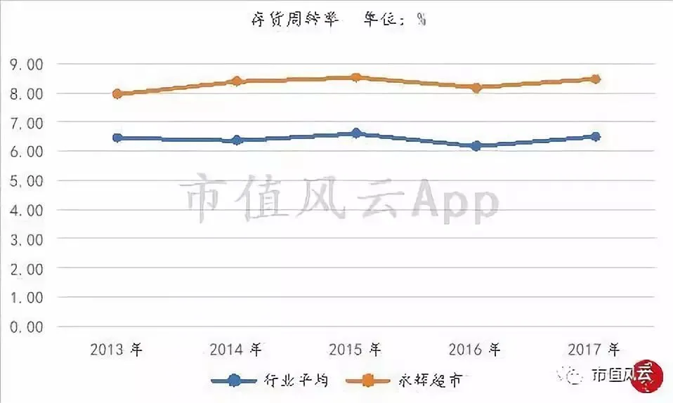 从下图可知,永辉超市的存货周转率在2013年之后就有显著提升,而且各期的存货周转率要明显高于同行平均水平。
