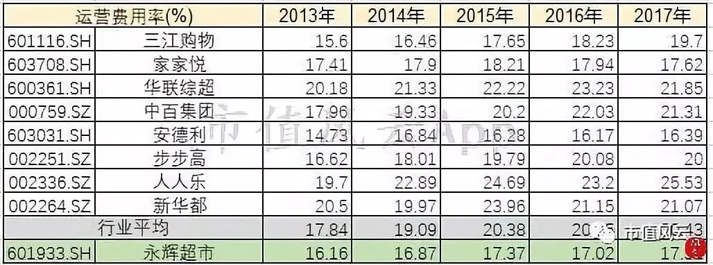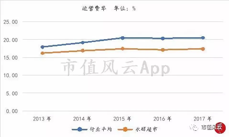 从下图可知,即使永辉超市营收从2013年的300亿逐年增加至2017年的585亿,永辉超市的运营费率依然稳定在17%上下,而且低于商超行业平均将近3个百分点左右。