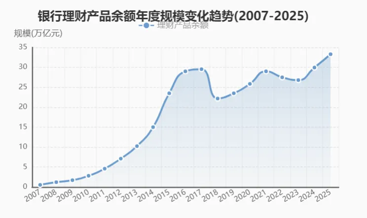 我们的存款,正在搬家吗?|一份银行理财研报的解读笔记.风险提示:本文为个人学习笔记,仅用于记录和分享本人对于公开研报的理解,不构成任何投资建议。股市有风险,投资需独立决策。 你有没有想过一个问题:我们存在银行里的钱,到底去了哪里? 截至2025年底,中国居民的银行存款已经达到165.9万亿元,占比GDP比重为118%,这是个什么概念?相当于每个人平均存款近12万元。更关键的是2026年预计存款50~60万亿元的定期存款将到期,占存款总量的1/3。 这些钱是继续存在银行?还是流向其他地方?银行理财,基金,保险,谁会成为下一个钱袋子? 带着这些问题,我读完了华创证券的银行理财研报,以下是我的学习笔记。 银行理财,简单来说就是你把钱交给银行,银行帮你投资赚钱。门槛低,风险相对小,有银行做信用背书,是大多数人接触的第一个理财产品。数据来源:WIND,华创证券,虽经核对,仍可能存在偏差,欢迎指正。 这张图是我国银行理财20年的缩影,2009年到2017年一路狂飙,规模从1.7万亿冲到29.5万亿;2018年资管新规后跌到22万亿:之后开启净值化新代,到2025年有涨到33万亿,创下历史新高。 2018年资管新规是一个分水岭,之前是资产端驱动——谁能拿到高收益资产,谁就牛;之后是需求端驱动——谁能满足客户需求,谁就牛。资产驱动时代:银行就像“淘金”到处找高收益项目(房地产,基建),然后把理财资金投进去,给你6~8%甚至更高的收益率。需求驱动时代:银行变成了“理财顾问”围绕你的需求设计产品——要稳健的有固收类,要收益的有权益类,要灵活的有现金管理类。
