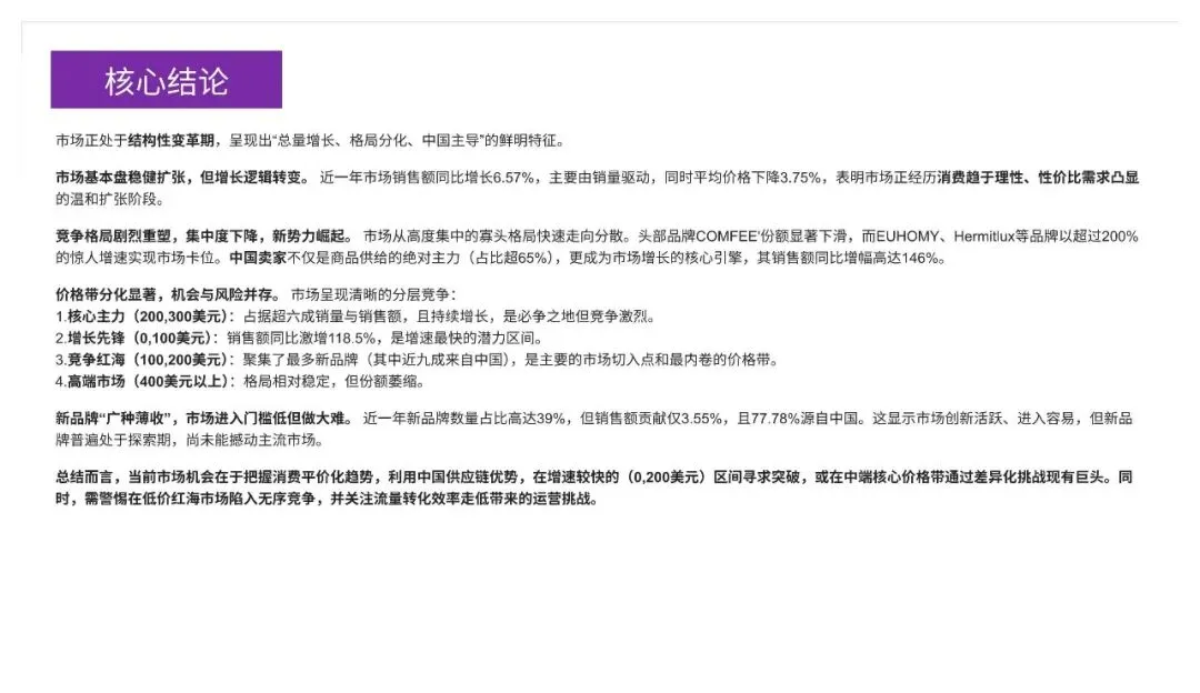 竞争格局剧烈重塑,集中度下降,新势⼒崛起。 市场从⾼度集中的寡头格局快速⾛向分散。头部品牌COMFEE'份额显著下滑,⽽EUHOMY、Hermitlux等品牌以超过200%的惊⼈增速实现市场卡位。中国卖家不仅是商品供给的绝对主⼒(占⽐超65%),更成为市场增⻓的核⼼引擎,其销售额同⽐增幅⾼达146%。