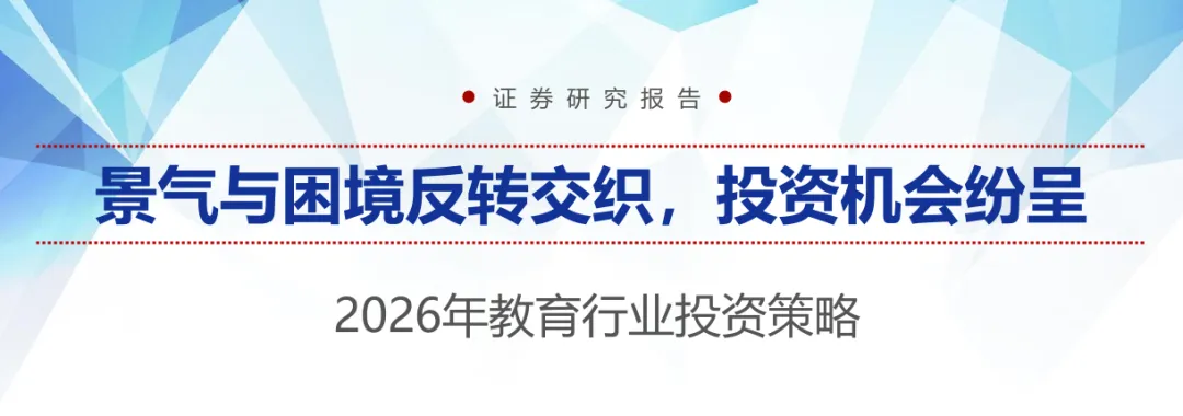 2026年,教育行业将在政策修复、需求释放、格局重塑三条主线中迎来结构性投资机会。无论是高教的估值修复、职业教育的景气上行,还是教培的品牌化发展,都值得投资者持续关注。