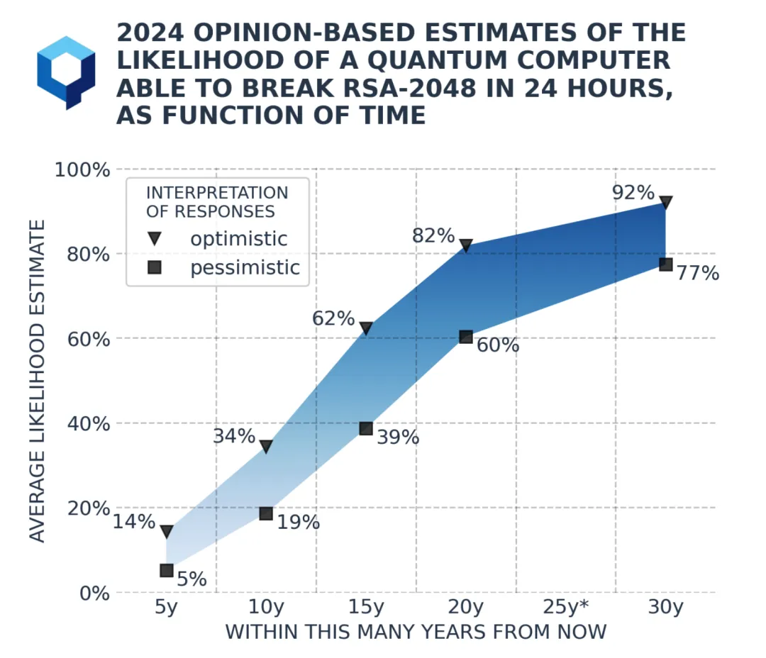据 Global Risk Institute(量子威胁时间线报告,基于数十位专家)预测,RSA 加密算法在 8 年后(2034 年)被量子破解的概率约 19–34%(2024/2025 数据),相比前几年,该时间线略有加速。后量子密码学(Post-Quantum Cryptography)就是在人们对 Q 日的日益担忧中应运而生,如今已发展为抗量子研究的基石。
