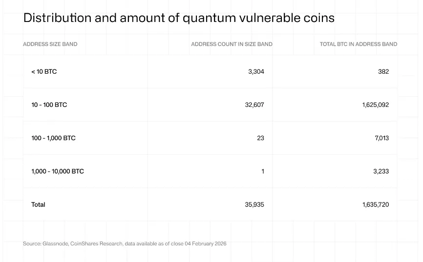 尽管目前看来,比特币还并未受到实际的量子攻击和安全威胁,但是有少部分的比特币是处于量子风险中的。在美国新泽西的金融公司 Coinshares 表示,那些早期采用 Pay-To-Public-Key (P2PK) 格式的公钥地址最容易成为量子攻击的目标,约有 160 万的地址(占总量的 8%)会被更容易受到威胁。而大概率造成市场波动的数量约 10000 比特币。