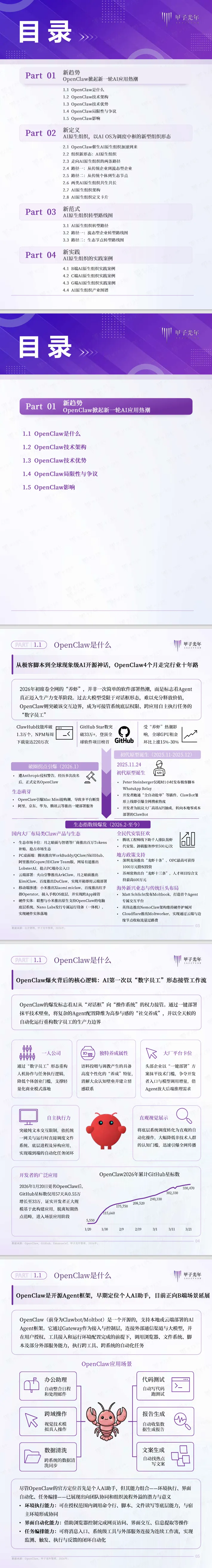 摘要:OpenClaw作为开源Agent框架,4个月走完行业十年发展路径,从个人AI助手向B端场景快速延展,它让AI从对话能力转向实际执行,具备全域执行、跨工具调度、任务自动拆解、闭环执行的能力,真正实现AI“干活”。本报告分析了OpenClaw催生的AI原生组织——以AIOS为调度中枢、Agent为执行单元的动态协同网络,梳理了企业转向流态型企业、个体转向生态节点的转型路径,以及对应的实践案例,展现AI驱动的组织形态变革方向。