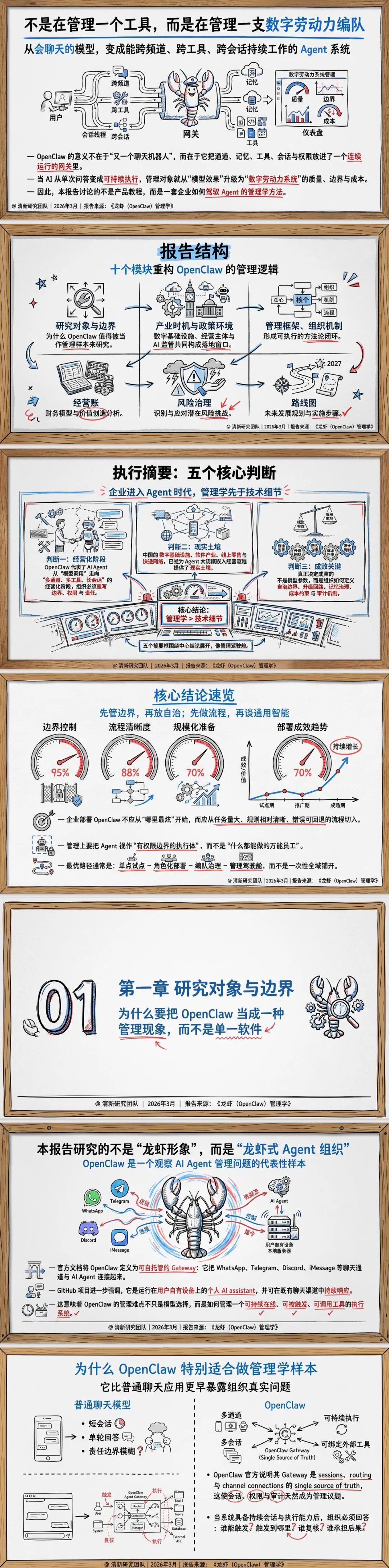 摘要:面向AIAgent时代,OpenClaw作为代表性样本,催生了全新的龙虾式Agent组织管理范式。本报告提出八层管理模型,明确战略、通道、流程、权限等全链路管理逻辑,总结七大落地原则:先管边界再放自治、先流程后智能,强调流程设计是部署前置工程,需明确人和Agent的接力点、固化异常升级制度。同时梳理了企业部署路径:1个月单点试点、3-6个月角色化复制,最终搭建整合经营、风险、资产三类指标的管理驾驶舱,帮助企业将Agent从技术试点落地为稳定的经营系统。