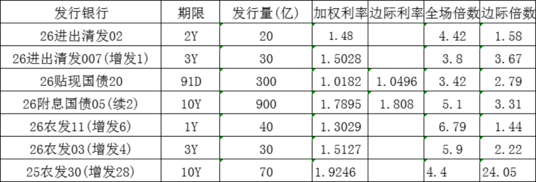 今日农业发展银行发行1年政策性金融债,发行量40亿元,发行利率1.3029%,投标倍数6.79倍,边际倍数1.44倍;农业发展银行发行3年政策性金融债,发行量30亿元,发行利率1.5127%,投标倍数5.9倍,边际倍数2.22倍;农业发展银行发行10年政策性金融债,发行量70亿元,发行利率1.9246%,投标倍数4.4倍,边际倍数24.05倍。
