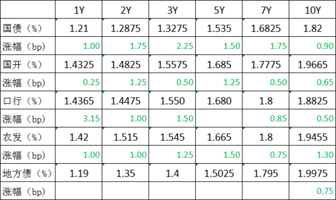 截止17:10,利率债二级市场中,利率成交价格总体呈上涨趋势,其中上涨程度较大的有1年期口行债,收益率上涨3.15bp,报1.4365%;3年期国债,收益率上涨2.25bp,报1.3275%;7年期国债,收益率上涨1.75bp,报1.6825%,2年期国债,收益率上涨1.75bp,报1.2875%。