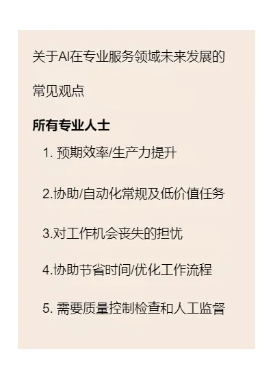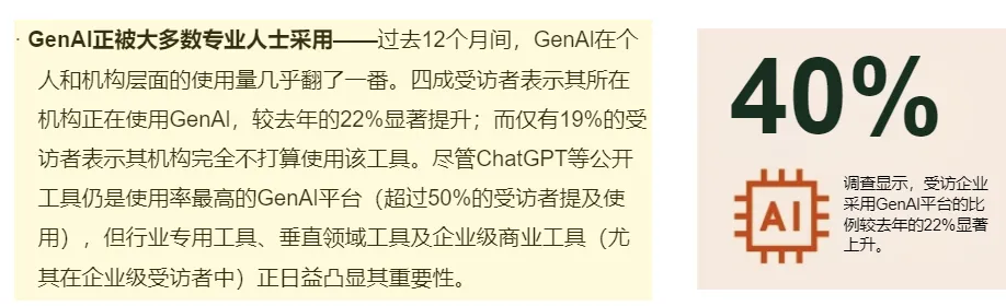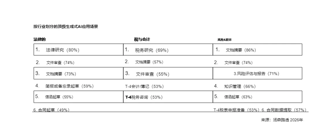 报告数据显示,专业服务领域的AI应用已从“尝鲜”变成“标配”: