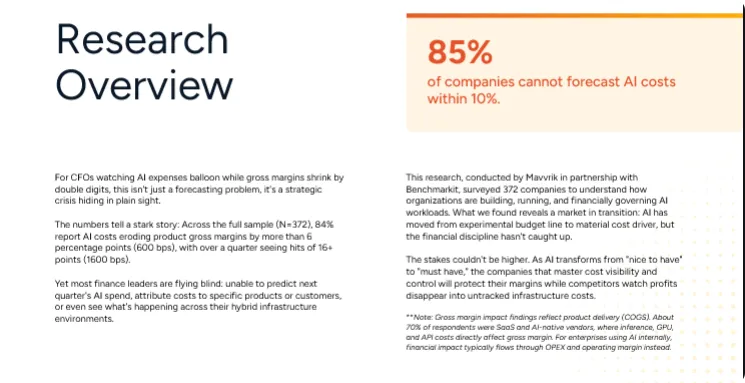 最近,Mavvrik×Benchmarkit发布《2025年人工智能成本治理状况报告》,调研全球372家企业,用一组扎心数据,揭开AI规模化背后的财务危机。