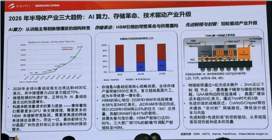 3月25日,SEMICON/FPD China 2026在上海开幕( 中国国际半导体展览会),通过与多家产业链公司深入的交流。随着算力需求由训练向推理迁移,产业景气的核心拉动已从单一先进逻辑扩产,逐步转向以HBM、先进封装和高性能互连为代表的系统级能力升级;对应到设备端,行业竞争也正由单点设备的国产替代,进一步演进为围绕关键工艺、复杂良率与平台化能力的深层突破。