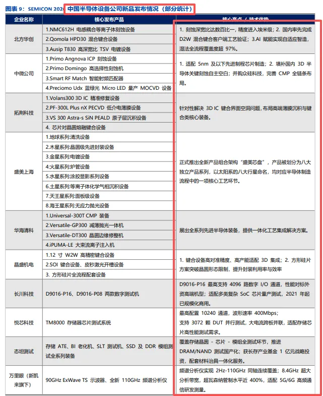 中国头部半导体设备供应商新品发布情况:能力边界明显外扩,行业演进由单一环节迈向更高层级的工艺覆盖与平台化布局。一方面,以刻蚀、薄膜沉积、清洗等为代表的优势前道设备持续向更高制程节点、更复杂器件结构迭代,国产厂商在部分核心工艺环节的性能、稳定性与客户验证进度已显著提升;另一方面,围绕先进封装、3D集成、高带宽存储及高频高速测试等新需求,国内厂商在混合键合、TSV、电镀、键合修复、存储测试及高端测试仪器等关键“卡脖子”环节也加快突破,设备布局正从传统晶圆制造向先进封装与测试验证延伸。随着客户端验证持续推进、工艺协同能力增强及产业链本土配套逐步完善,国产设备有望在先进封装及AI相关新增设备需求中率先实现更高渗透。