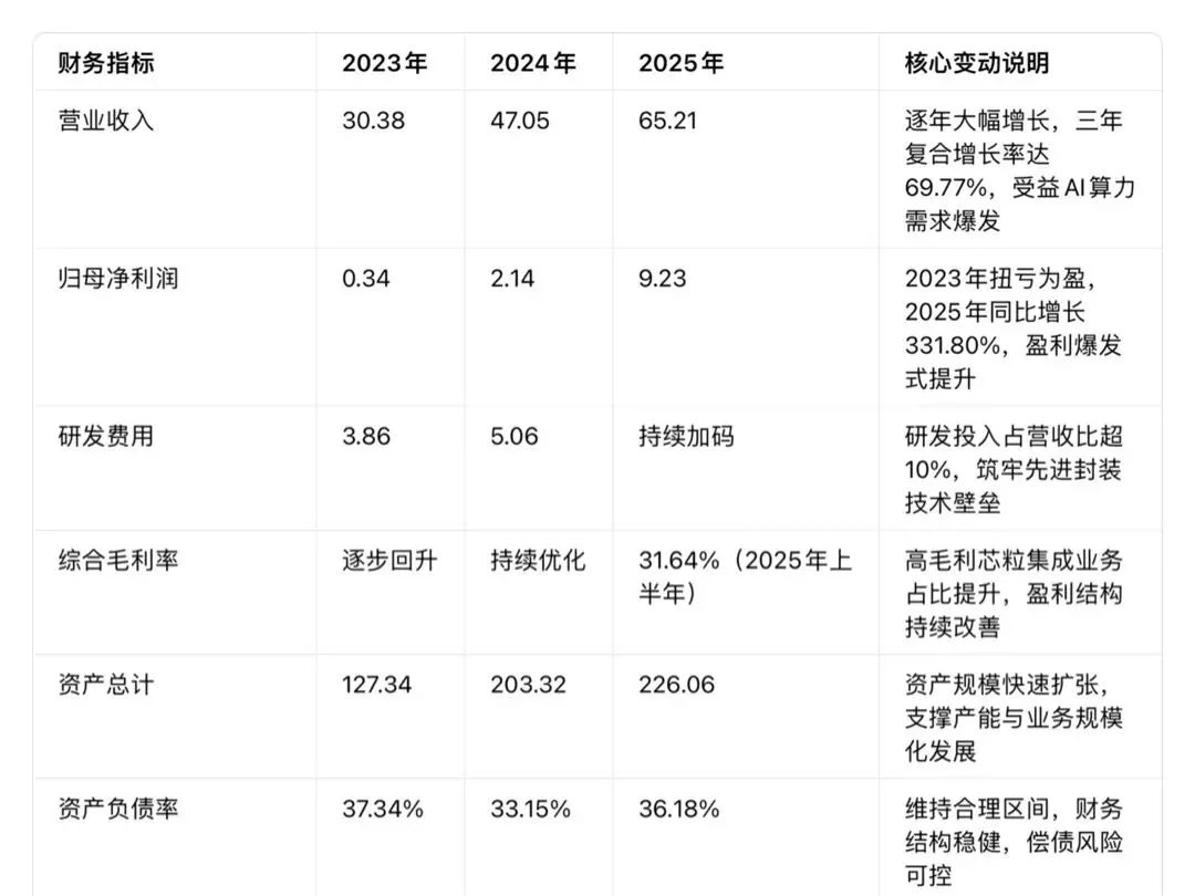 受益于AI算力需求爆发与先进封装业务放量,公司近年经营业绩呈现指数级增长,彻底摆脱前期亏损状态,实现高质量规模化盈利,核心财务数据表现亮眼。