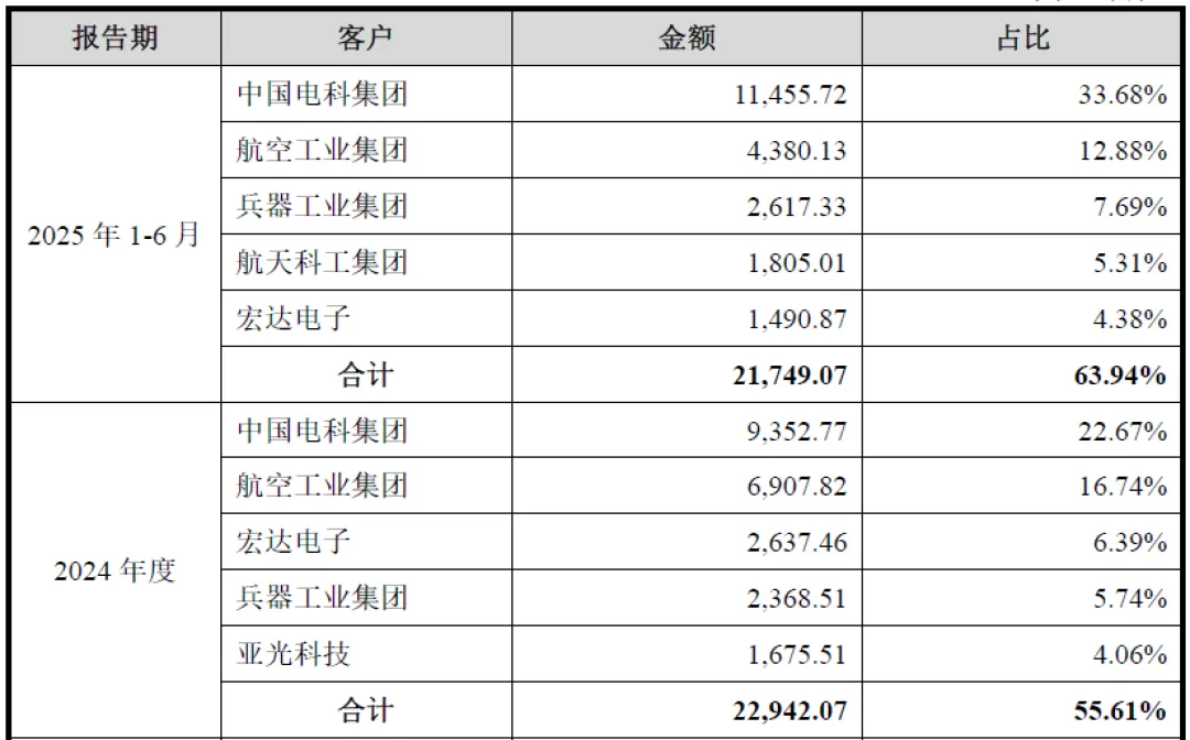公司下游客户以军工集团下属科研院所及企业、民营军工配套企业为主,客户群体广泛且优质,报告期内累计向超过1600家客户供货,客户集中度相对较低,不存在对单一客户的重大依赖。主要客户包括中国电科集团、中国电子集团、航空工业集团、航天科工集团、航天科技集团、兵器工业集团等各大央企军工集团,以及北斗星通、睿创微纳等民营军工企业。