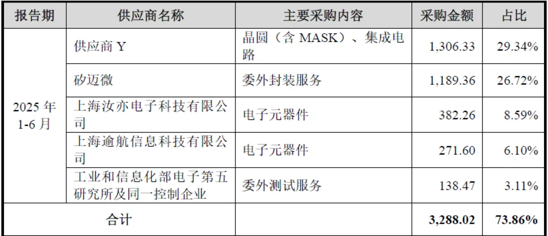 公司采购内容包括晶圆、封装材料、电路板等物料,供应商集中度相对较高。报告期各期,向前五大供应商采购金额占当期采购总额的比例分别为77.71%、67.30%、73.89%和73.86%,主要供应商多为集成电路行业内具有较强实力的企业,包括晶圆制造、封装测试等领域的专业厂商。