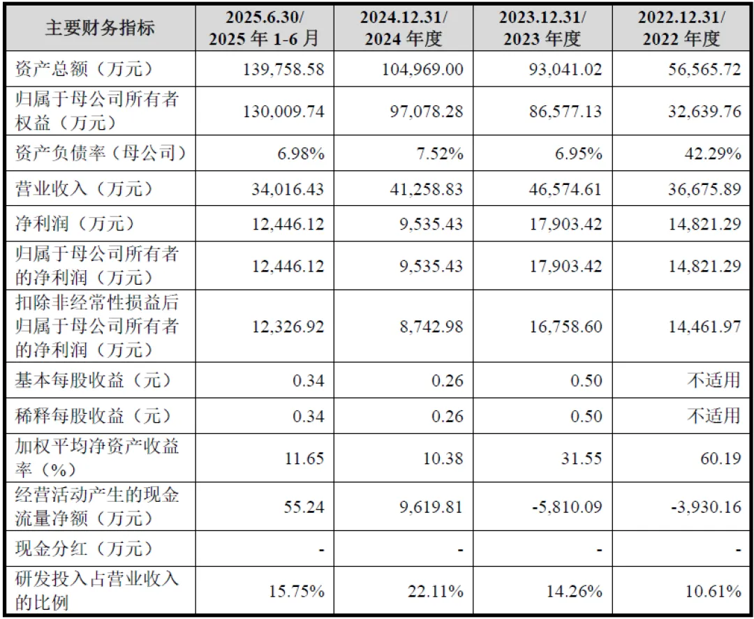 公司资产总额持续增长,从2022年末的5.66亿元增至2025年6月末的13.98亿元,主要得益于净利润积累及增资扩股。资产负债率维持在较低水平,2025年6月末仅为6.98%,远低于行业平均水平,财务风险较低,偿债能力较强。归属于母公司所有者权益稳步增长,权益资本充足,为公司持续发展提供了坚实的资金保障。