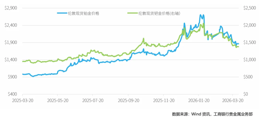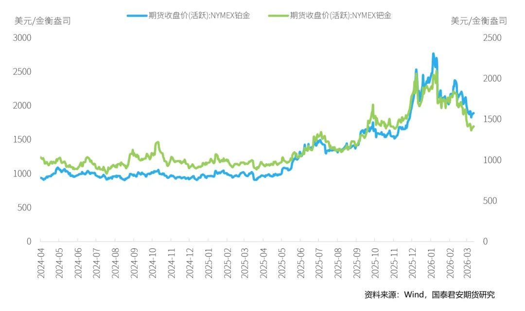 本周,铂金期货价格有所下跌,截至2026年3月27日,NYMEX铂金期货价格收盘价为1866.4美元/盎司,周累计下跌2.80%。钯金方面,本周NYMEX钯金期货同样下跌,周五收盘价为1384.5美元/盎司,周下跌2.12%。