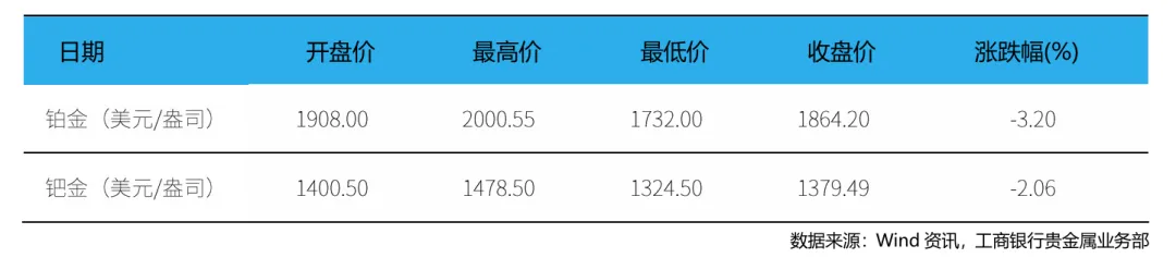 本周(3月23日 – 3月29日,下同),现货铂金开盘价为1908美元/盎司,最高价为2000.55美元/盎司,最低价为1732美元/盎司,收盘价为1864.2美元/盎司,周累计下跌3.2%。现货钯金开盘价为1400.5美元/盎司,最高价为1478.5美元/盎司,最低价为1324.5美元/盎司,收盘价为1379.49美元/盎司,周累计下跌2.06%。