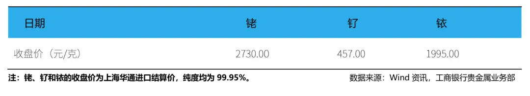 根据上海华通的数据显示,截至3月27日,99.95%现货铑金进口结算价为2730元/克,下降4.04%。99.95%现货钌金进口结算价为457元/克,上涨0%。99.95%现货铱金进口结算价为1995元/克,上涨0%。