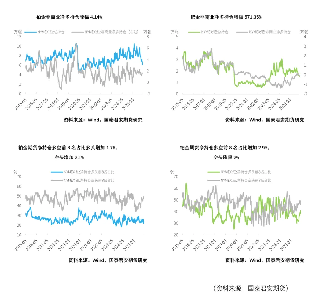 截至2026年3月24日,铂金总持仓较上周减少5819张,其中非商业多头方面减少4026张,非商业空头持仓较上周减少3326张,降幅25.06%。因此,非商业净多头持仓减少700张,降幅4.14%。钯金方面,总持仓减少487张,降幅3.13%,其中非商业多头持仓减少790张,降幅10.88%,空头增加267张,增幅3.59%,因而非商业净多持仓减少1057张,增幅571.35%。在净持仓多空前8名占比上,本周铂金方面净持仓多头占比增加1.7%,空头占比增加2.1%,钯金方面多头占比增加2.9%,空头占比降幅2%。