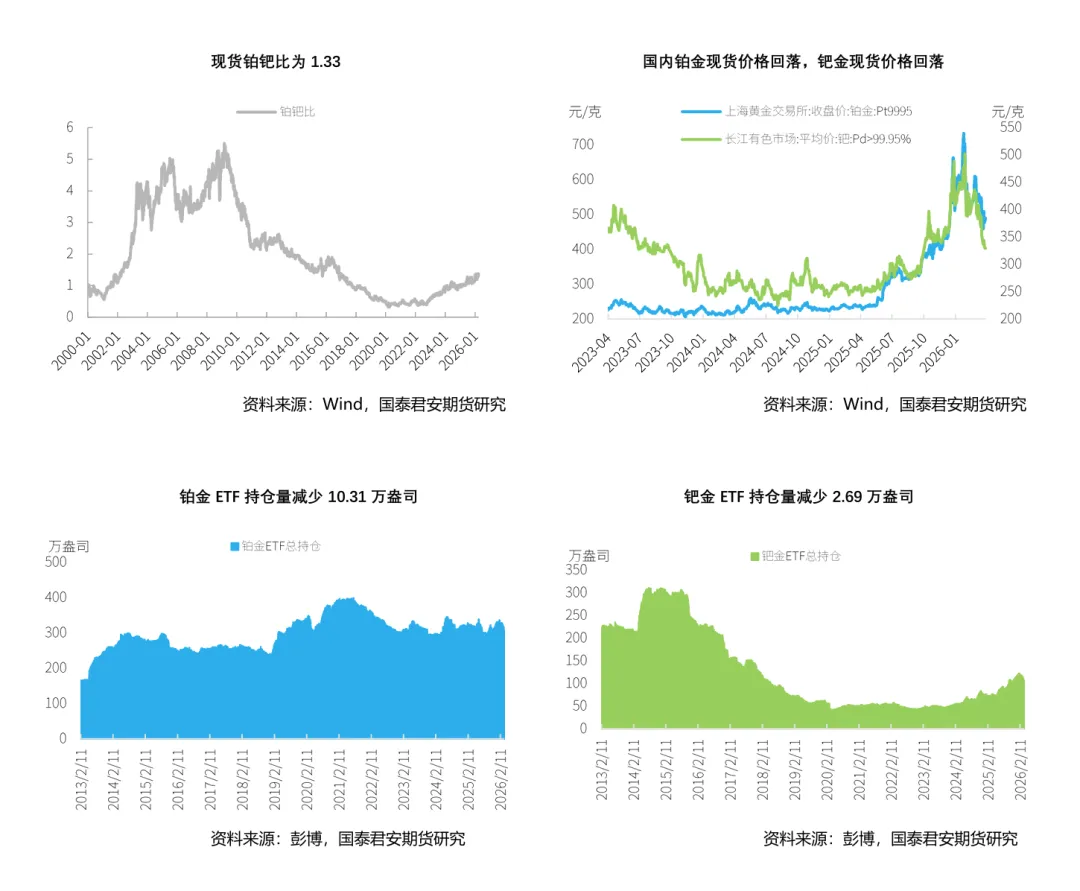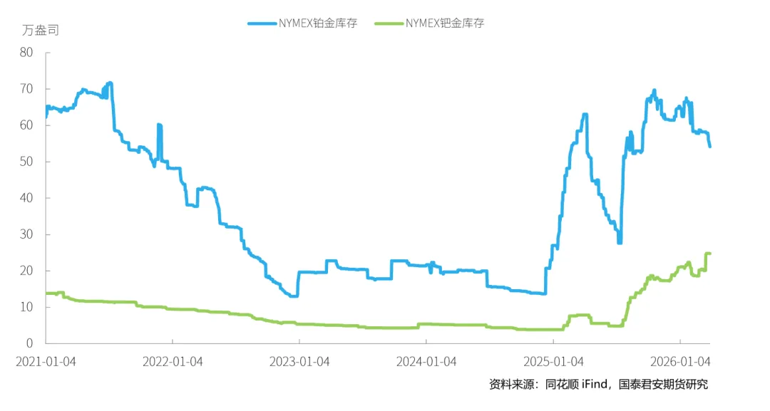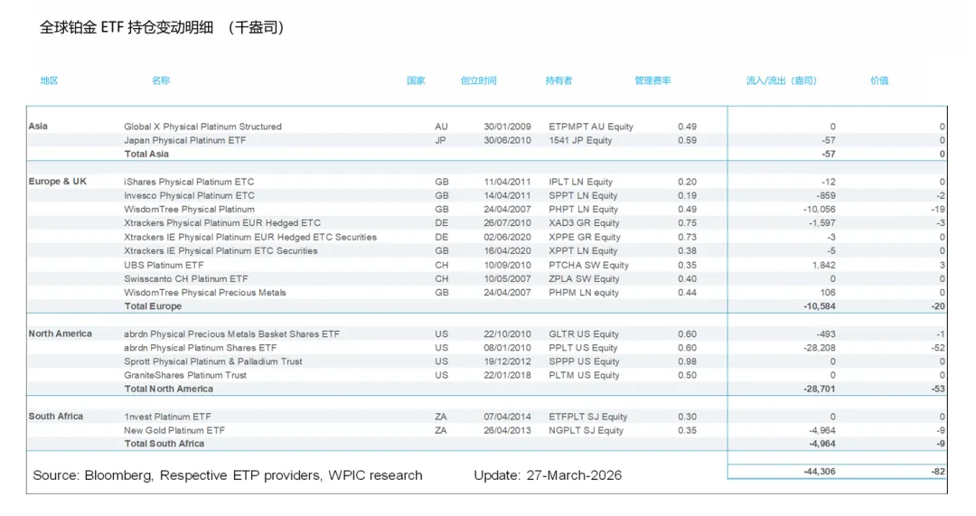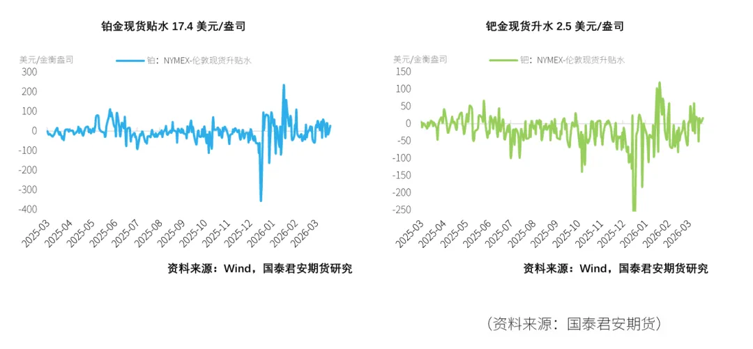 截至2026年3月27日,当周NYMEX铂金库存去库2.50万盎司,钯金期货库存持平。在现货升贴水方面,本周铂金升贴水有所波动,以周五收盘价来看贴水17.4美元/盎司。钯金同样波动,周五升水2.5美元/盎司。ETF持仓量情况,铂金持仓量回落,其全球ETF持仓量本周减少10.31万盎司,钯金持仓量回落,ETF持仓量本周减少2.69万盎司。