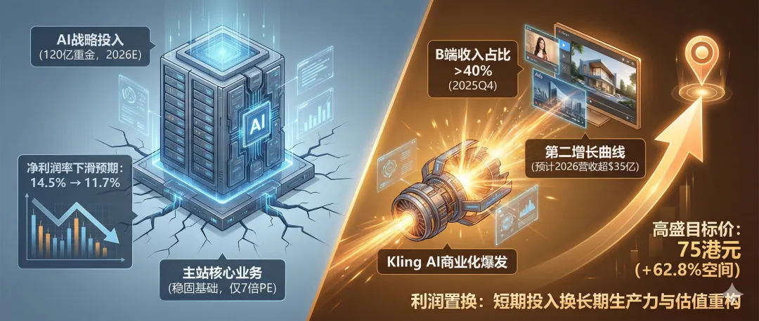 高盛目标价75港元对应主站10倍PE及Kling 25倍P/S。这意味着,即便不考虑Kling的超预期爆发,仅主站业务的估值修复就能带来可观回报;若Kling商业化成功,其作为独立AI资产的价值将被市场重估,贡献巨大的期权价值。