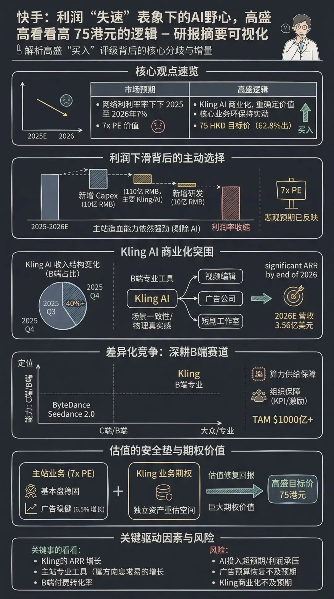 高盛维持“买入”评级的核心逻辑在于:市场过度关注AI投入对短期利润的侵蚀,却忽视了Kling AI在B端商业化上的爆发力及其作为独立AI资产的价值。当前股价隐含的主站估值仅7倍PE,提供了极高的安全边际,而Kling的商业化进展可能成为估值修复的强力催化剂。投资者应重点关注Kling的ARR增长及B端付费转化率,这将是打破市场悲观预期的关键。