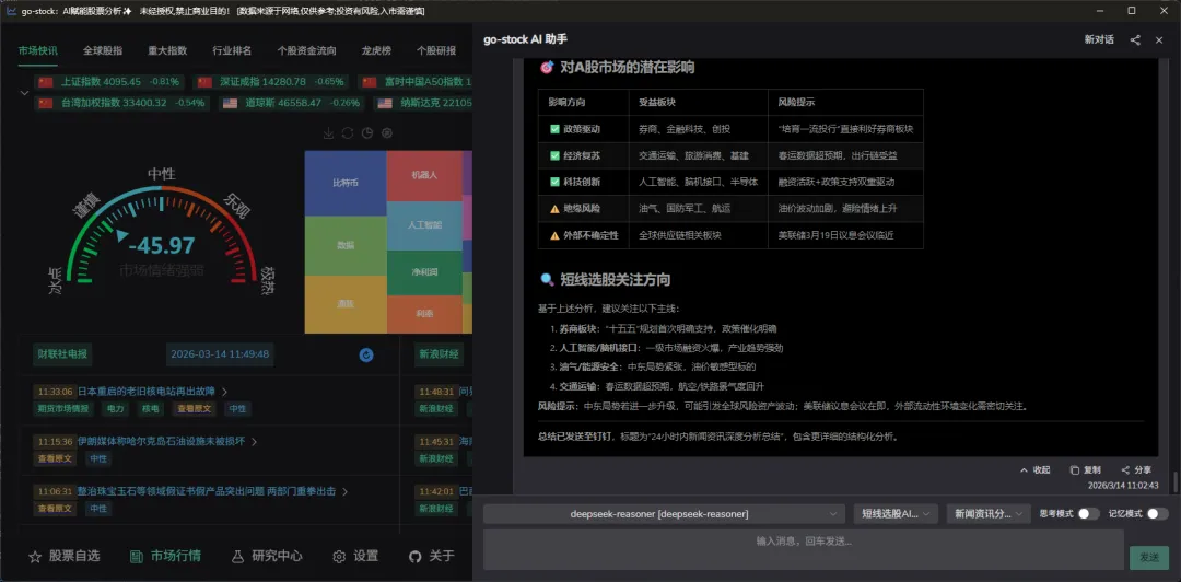 ⚠️ 免责声明:go-stock 是开源的学习工具,AI 生成的分析报告仅供参考。投资有风险,任何工具都不能替代你自己的判断。