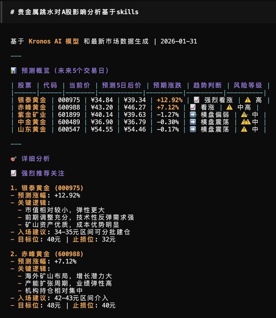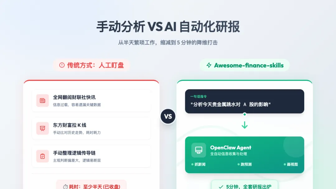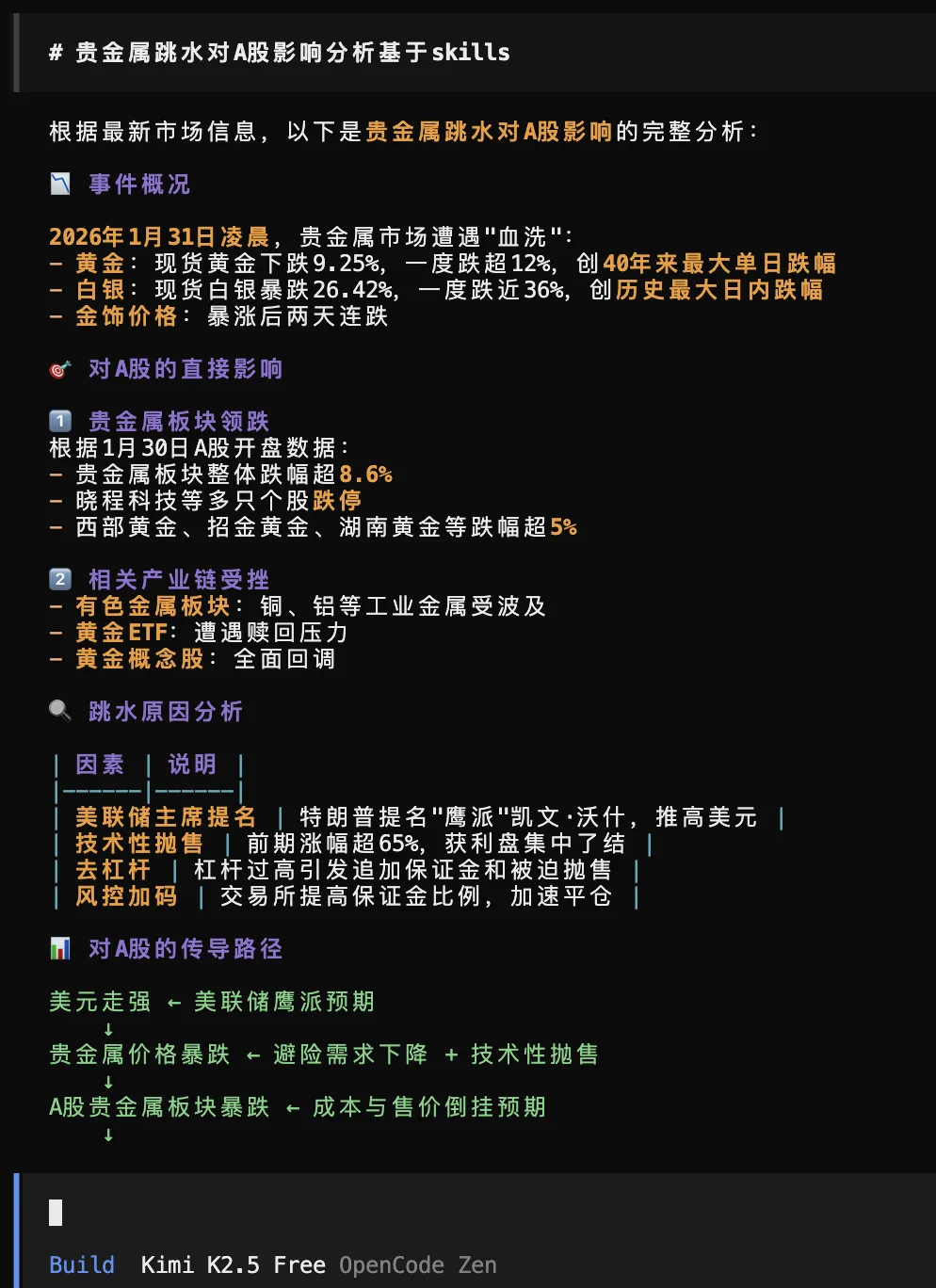 如果你自己做分析,流程大概是这样的:打开财联社翻快讯,切到微博看情绪,再去东方财富拉 K 线数据,然后手动整理出一条逻辑链——贵金属为什么跌、怎么传导到 A 股、哪些板块受影响。一个专业研究员,认真做完这套,至少半天,半天过去,股市都收盘了