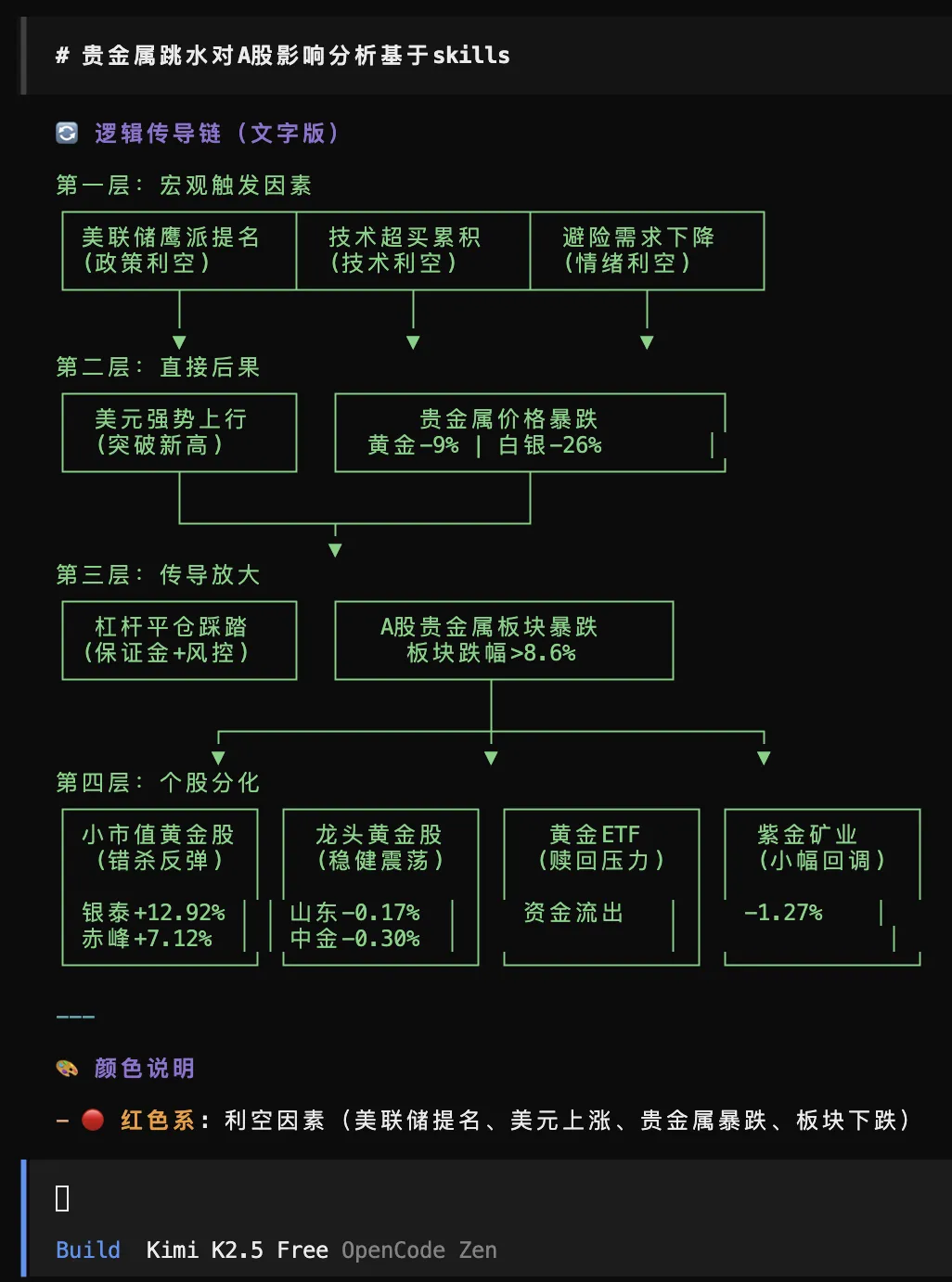 第二步,画出一张完整的市场传导链路图——贵金属跌了,为什么有色板块会联动,中间经过哪几步,每个环节是正面影响还是负面影响,全标出来了。