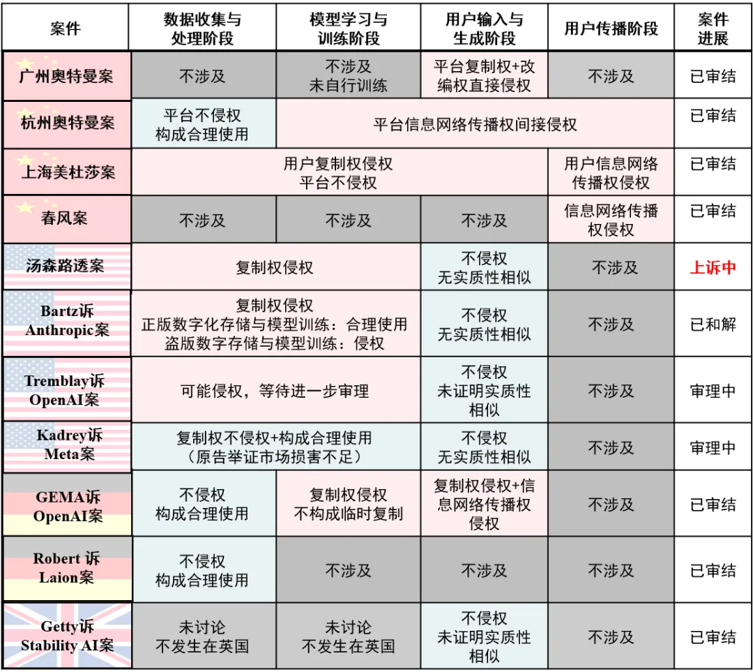 此外,针对 AI 行为的司法认定,应采取“阶段性拆解判定”还是“整体性判定”,全球司法界尚存分歧。广州奥特曼案采取了吸收逻辑,认为复制权与改编权的判定已足以涵盖信息网络传播行为,无需重复评价。美国法院在处理 AI 侵权案件时,亦呈现出明显的整体性判断倾向,尤其针对输入和训练阶段的行为,往往综合认定。而德国GEMA诉 OpenAI案则提供了拆解范式,对数据处理、模型训练及用户生成等各阶段行为进行独立定性。GEMA诉 OpenAI案甚至认定输出端的复现行为同时触及复制权与信息网络传播权,理由是生成内容在模型或用户服务器上的任何形式存储,均构成了对复制权的侵害。