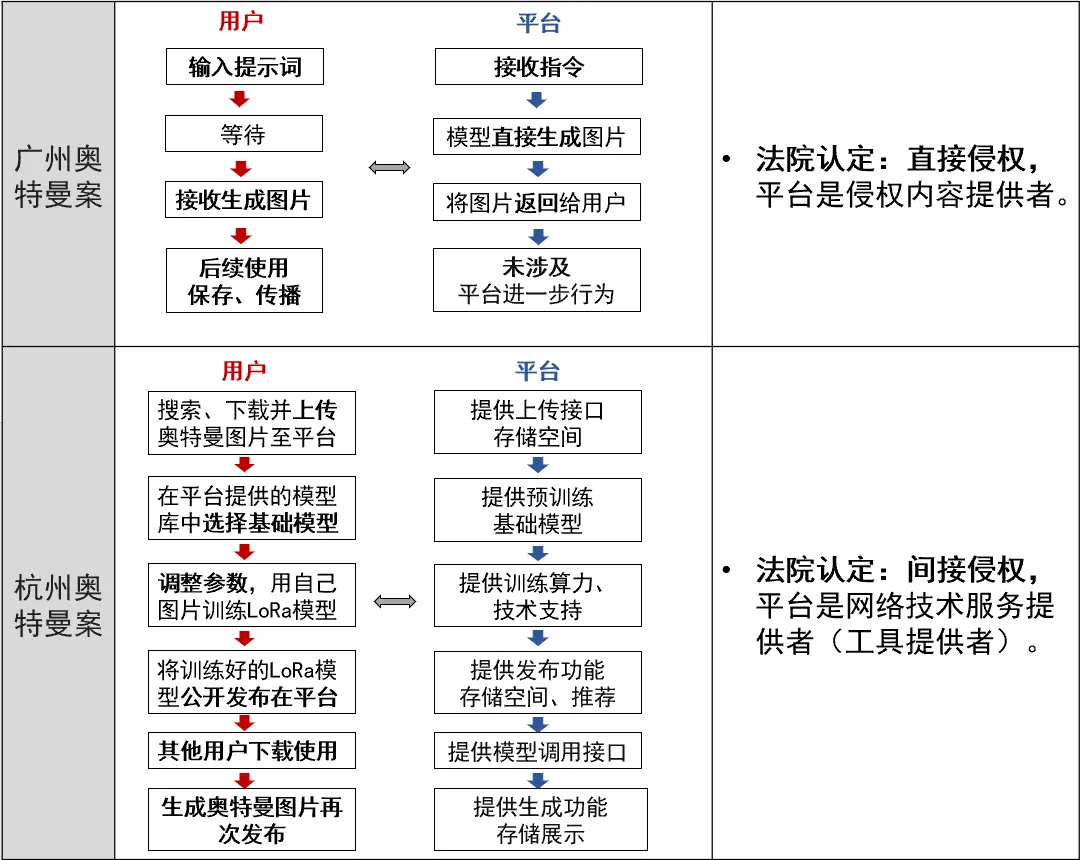 在涉AI平台的版权侵权责任认定中,首先需要区分平台承担的是直接侵权责任还是间接侵权责任。我国广州互联网法院审理的“奥特曼”案与杭州互联网法院审理的“奥特曼”案,恰好为这一区分提供了极具参考价值的司法样本。两案的核心差异表明,法院并非对AI平台采取一刀切定性,而是根据平台的具体功能架构和业务类型,对被诉行为进行精细化切割,对平台在不同环节所扮演的角色进行动态界定。