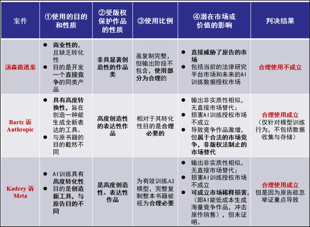 综上,当前针对AI模型训练行为是否损害原作品“潜在市场或价值”、“是否构成合理使用”的问题,在司法与学理上均存在分歧。可以预见,在未来一段时间内,这一分歧将持续存在,直至相关法律规则通过更多判例得以进一步明晰。