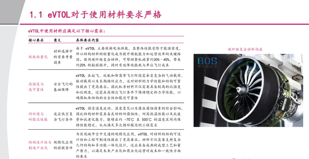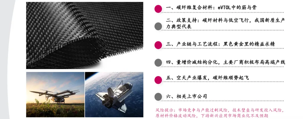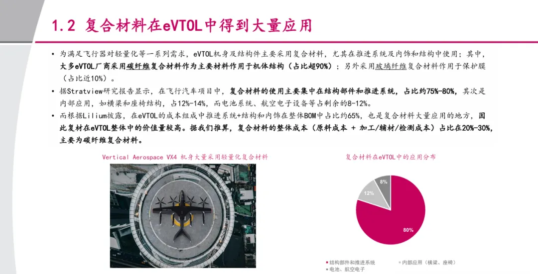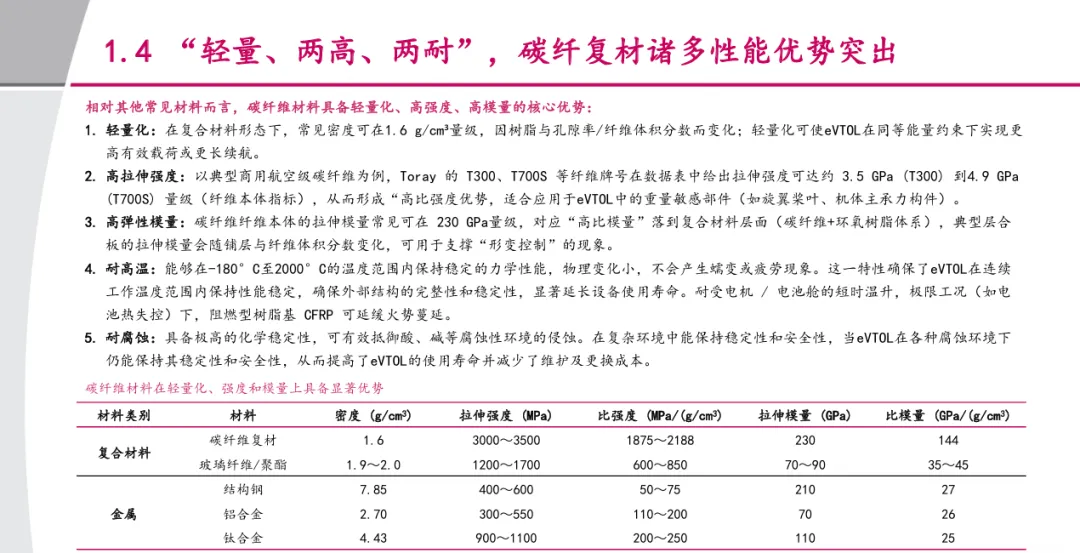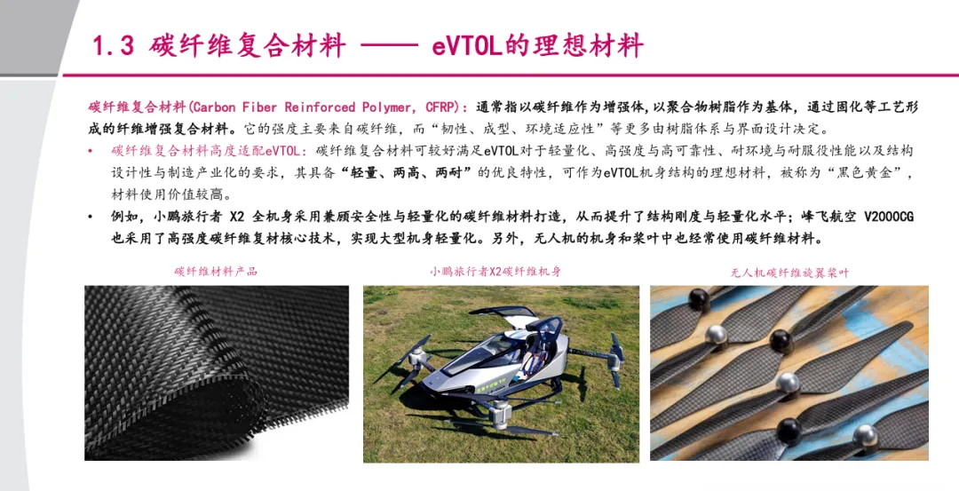 摘要:低空经济与航天产业的双重驱动下,碳纤维复材成为eVTOL(电动垂直起降飞行器)产业的核心增长赛道。碳纤维复材凭借轻量化、高强度、高模量、耐高低温的特性,完美适配eVTOL对减重、续航、可靠性的核心需求,已在小鹏旅行者X2、峰飞航空机型中落地应用。据测算,十五五期间,仅eVTOL领域就将带来4712吨的碳纤维复材新增需求,对应新增市场规模85亿元,单机碳纤复材用量达693kg、价值量125万元,叠加无人机等低空场景的需求,行业迎来高速增长的窗口期。