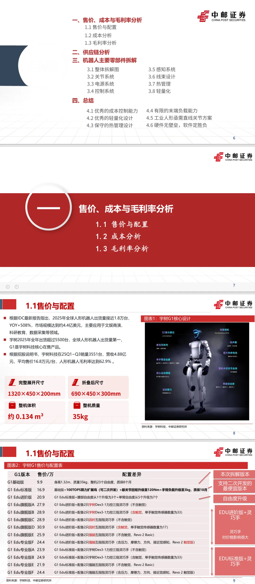 摘要:宇树G1作为面向消费与科研场景的人形机器人,基础版售价8.5万元,身高1.32m、整机重量35kg,配备23个自由度,膝关节最大扭矩达90N・m,续航可达1-2小时,EDU教育版最高售价30.9万元,可升级至100TOPS算力。本次拆解显示,基础版整机BOM成本约4.16万元,核心关节成本占比超66%,基础版毛利率40.7%,EDU版毛利率最高达66.7%。公司实现电机、驱动板等核心部件自研,关节采用四合一集成模组,中空内走线设计规避磨损,轻量化与热管理方案成熟,展现了消费级人形机器人的量产落地能力。