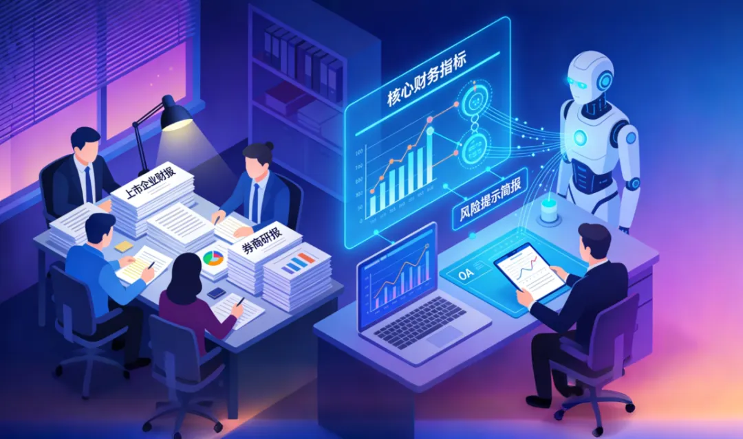 再比如:面对上百页的上市企业财报和几十份券商研报,你的投研团队还在熬夜划重点,而隔壁部门的AI助手已经“秒级”提取了核心财务指标,与内部数据库交叉比对完毕,并自动生成了一份风险提示简报,推送到了高管OA里。