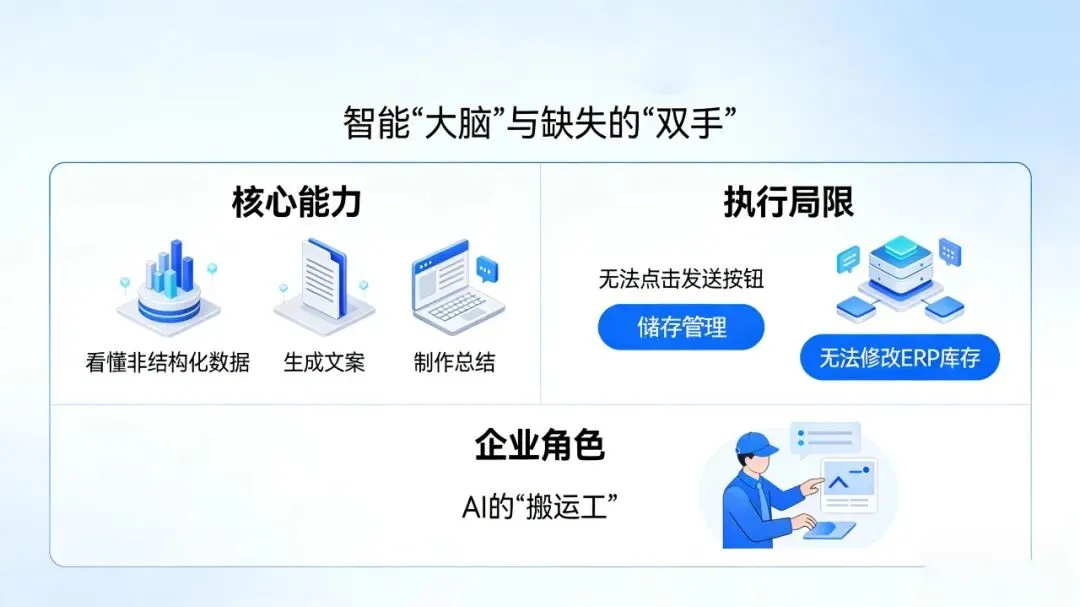 这两年火起来的大模型就是MaaS。它能看懂非结构化数据,能写文案、做总结。但CTO们很快发现,它只有“大脑”,没有“双手”。它不能帮你点发送按钮,不能帮你修改ERP库存,企业依然得充当AI的“搬运工”。