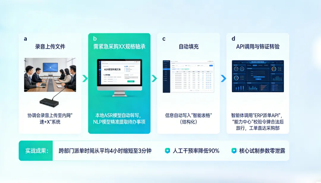 ·实战成果:跨部门派单时间从平均4小时缩短至3分钟,人工干预率降低90%,且因全程内网封闭,核心试制参数零泄露。