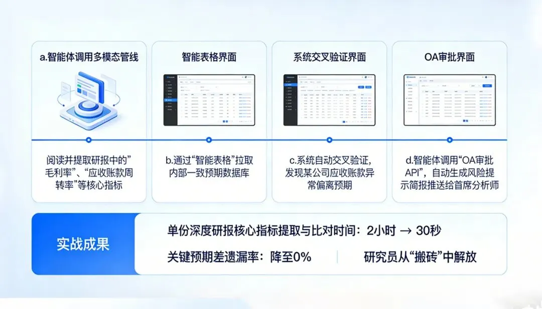 ·实战成果:单份深度研报的核心指标提取与比对时间,从2小时压缩至30秒,关键预期差遗漏率降至0%,彻底把研究员从“搬砖”中解放出来。