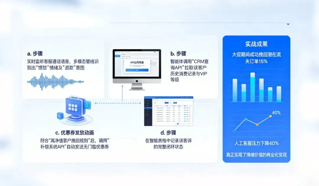 ·实战成果:大促期间成功挽回潜在流失订单15%,人工客服压力下降40%,真正实现了情绪价值的商业化变现。