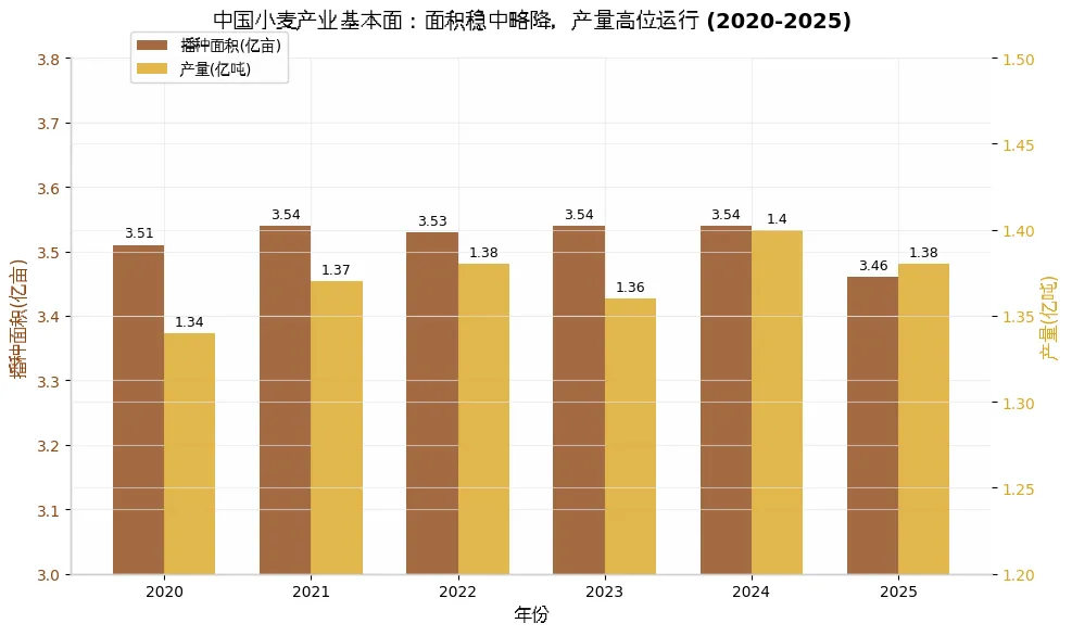 中国小麦产业正经历从”增产导向”向”效益导向”的深刻转型。2025年,全国小麦播种面积3.46亿亩,较上年减少0.1%,产量1.38亿吨,同比微降0.1%,结束了连续五年的增产周期。这一数据背后,是种植成本持续攀升与市场价格低迷的”剪刀差”挤压,以及进口量同比暴跌70%带来的市场结构重塑。