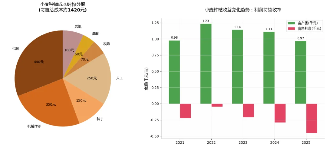 根据《2025年全国农产品成本收益资料汇编》数据,2024年小麦亩均物质与服务费用584.63元,加上人工、土地等成本,总成本达1198.68元/亩。2025年农资价格继续上涨,实际种植成本已达1420元/亩。