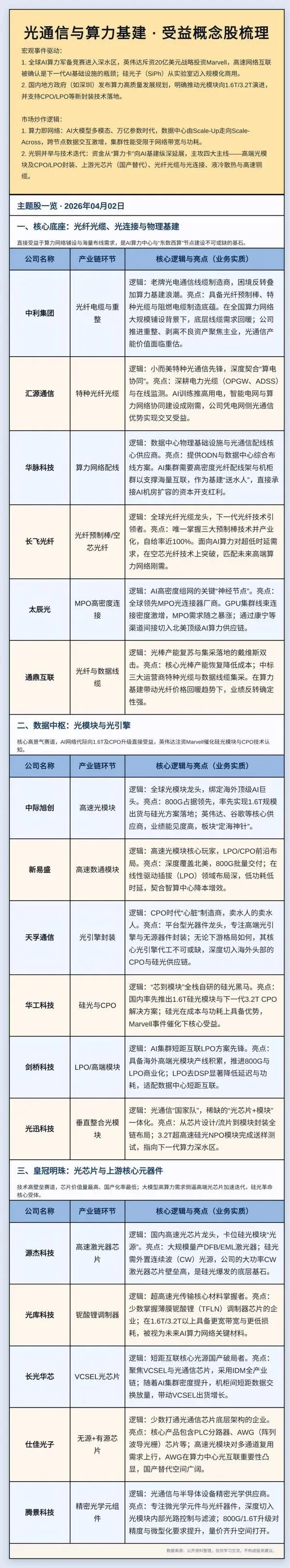 2、新技术产业趋势方向,有催化、算中远期空间:O(腾景科技、德科立、光库科技、光迅科技)、CPO(天孚通信、罗博特科、炬光科技);